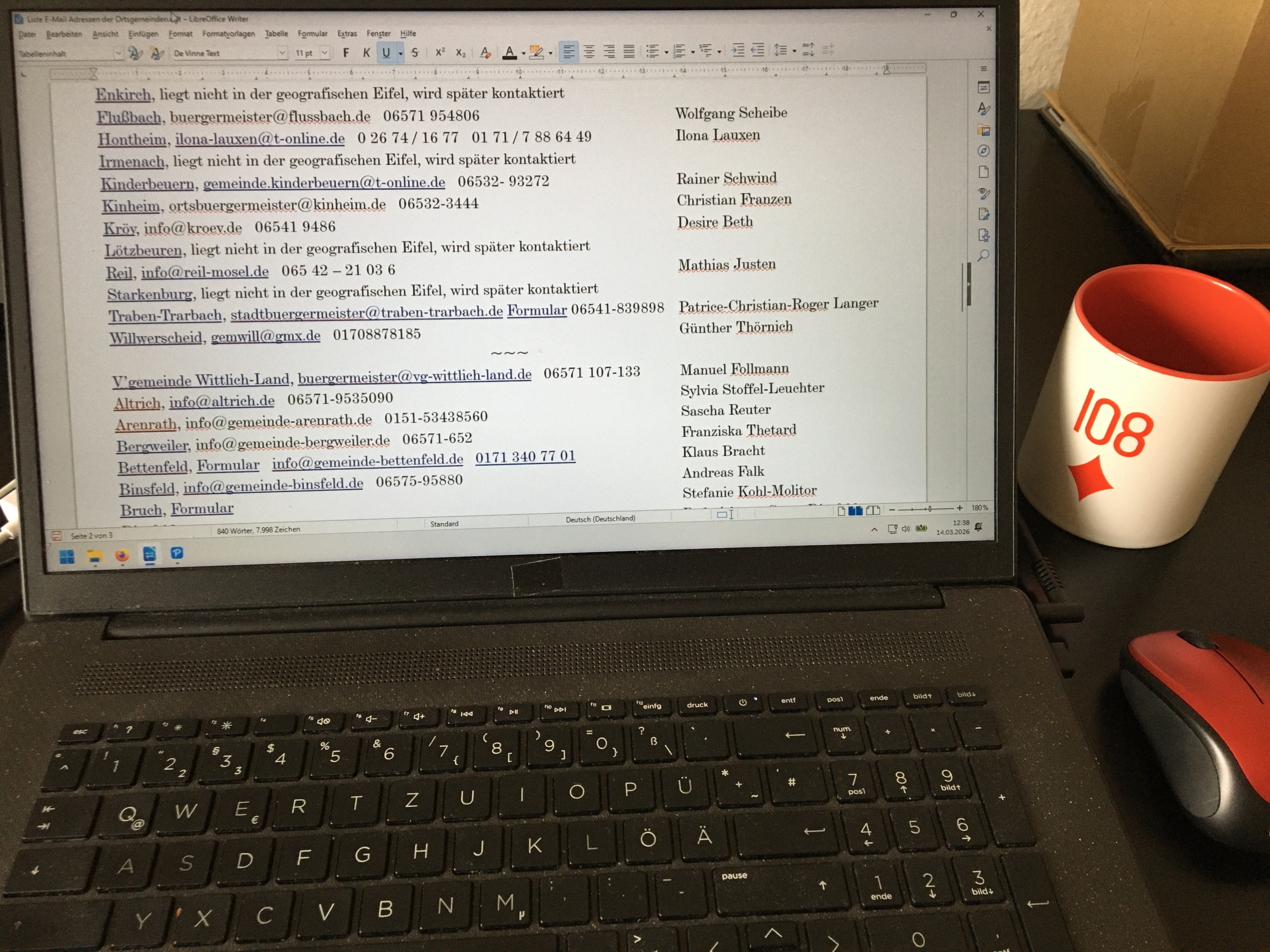 Beginnend mit dem Landkreis Trier-Saarburg werden jeden Tag die Ortsbürgermeister:innen aller Gemeinden der geografischen Eifel per E-Mail kontaktiert.